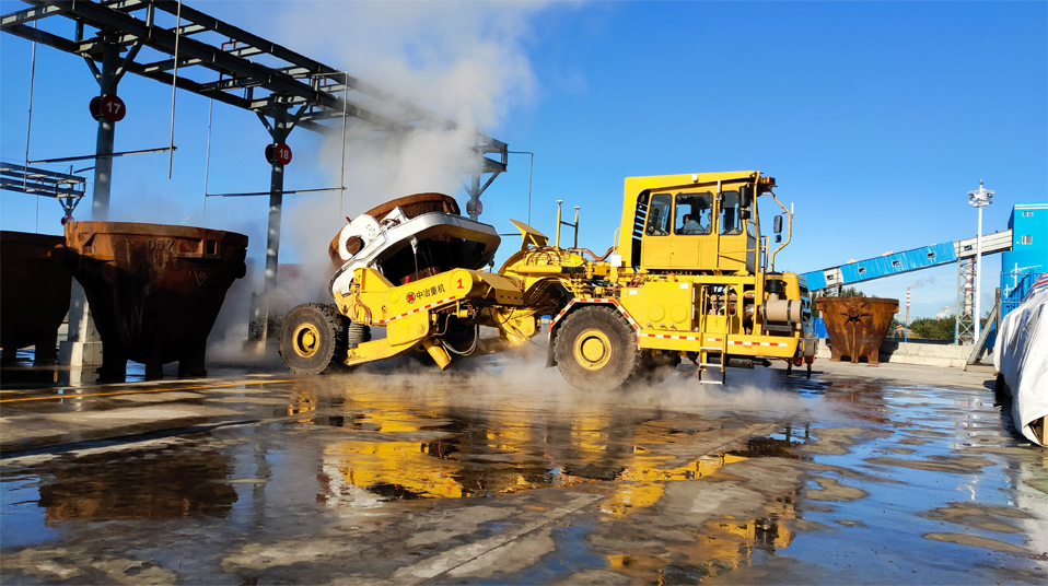 由中冶寶鋼研制的70噸鉸接式抱罐車,采用鵝頸鉸接型式,額定載重75噸,重載最高時速為每小時20公里,翻罐角度105度,最大爬坡能力8%,最小轉(zhuǎn)彎半徑9米。該車型應(yīng)用專利技術(shù)10項,在國內(nèi)有色冶煉市場占有率超過75%,先后榮獲中國有色工業(yè)協(xié)會、中國鋼鐵工業(yè)協(xié)會科技獎,中國施工企業(yè)管理和中國循環(huán)經(jīng)濟(jì)協(xié)會專利獎等榮譽。